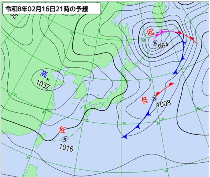 気象庁によりますと、日本付近は、16日から17日はじめにかけて、西高東低の気圧配置となるでしょう。また、関東地方南部から伊豆諸島付近は気圧の谷となる見込みです。