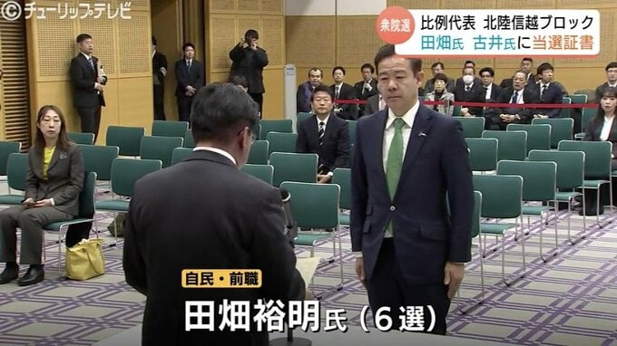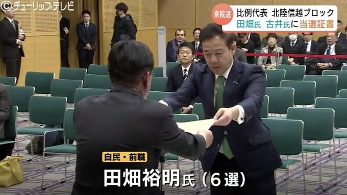 2月8日の衆議院選挙、比例代表北陸信越ブロックで当選した自民党の田畑裕明さんと古井康介さんに14日、当選証書が手渡されました。