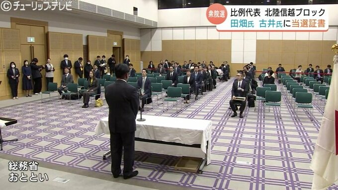 総務省であった付与式には、比例代表で当選した議員本人や代理が出席。中央選挙管理会の古屋委員長から1人1人に当選証書が手渡されました。