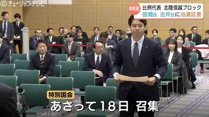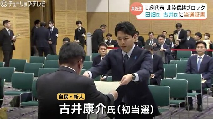 ニュースクリップ 比例で当選の田畑・古井両氏に当選証書 古井氏は18日臨時国会で初登庁 自民・北信越ブロック 富山 2026年2月16日(月) 19:30 国内 小選挙区の中田宏さん、比例で古井康介さん また、小選挙区で当選した中田宏さんと1区の支部長を争い、比例単独で立候補した自民新人の古井康介さんは初当選を果たしました。 18日は特別国会が召集され、古井さんは新人議員としての第一歩を踏み出します。