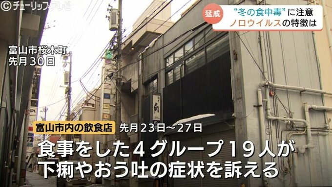 富山市内の飲食店では1月23日から27日にかけて食事をした4グループ19人が、下痢や嘔吐の症状を訴えました。