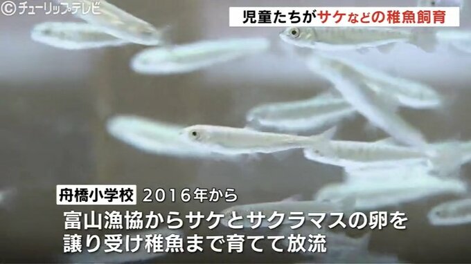 舟橋小学校では、毎年12月上旬に富山漁協からサケとサクラマスの卵を譲り受け、稚魚まで育てて放流する取り組みを10年前から続けています。