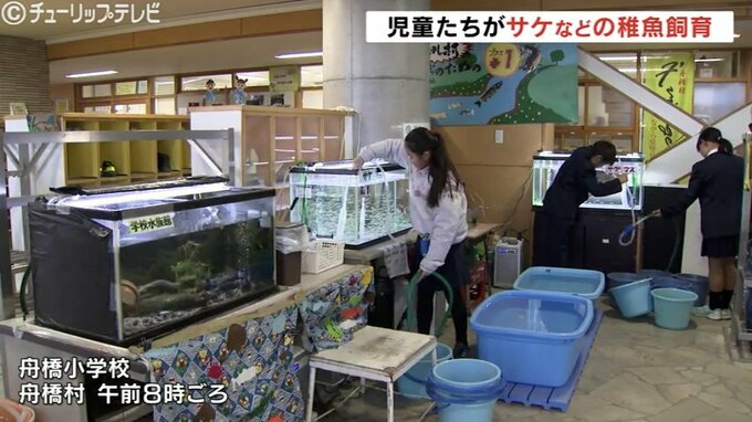 舟橋村では毎年、地元の児童たちがサケとサクラマスの稚魚を飼育しています。水槽の手入れやエサやりを行いました。