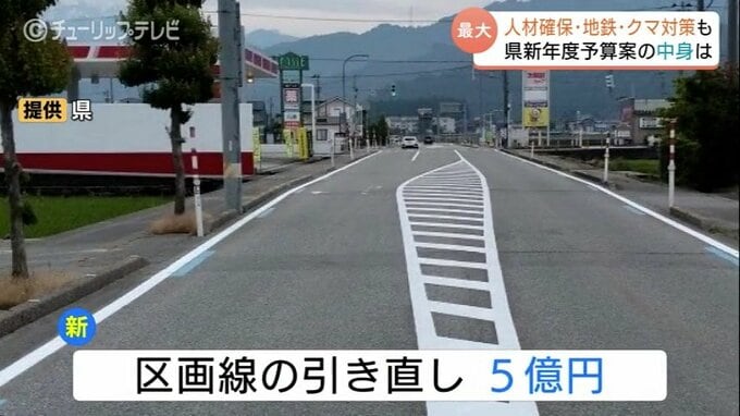 公共事業では、老朽化した道路の維持・管理に集中投下。新年度では、5億円を区画線の引き直しに充てるとしています。