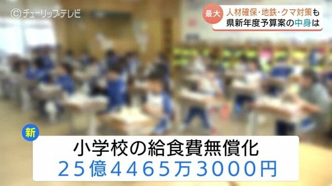 このほかにも、国の政策を受けた小学校の給食費無償化の費用負担として25億4465万円あまりが計上されました。