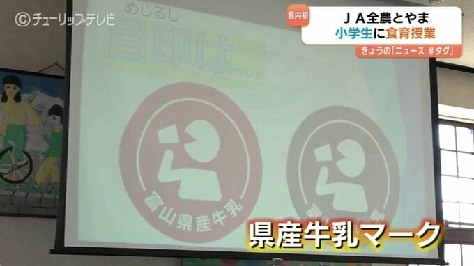 授業には、富山市の池多小学校の児童40人が参加。JA全農とやまの担当者らが、牛乳が生産されてから消費者に届くまでの流れや、去年、新しく作った県産牛乳のマークを紹介しました。