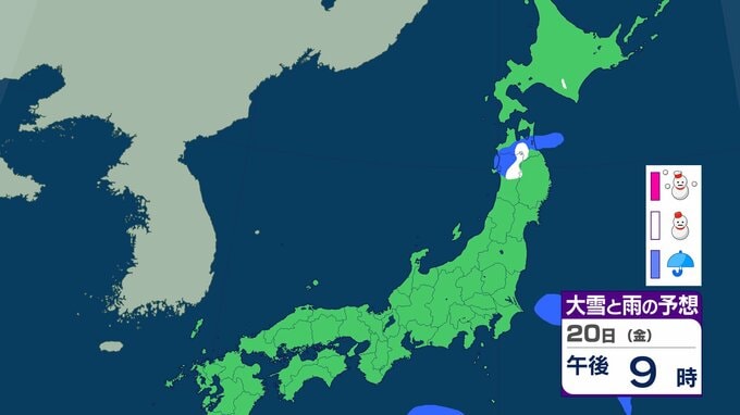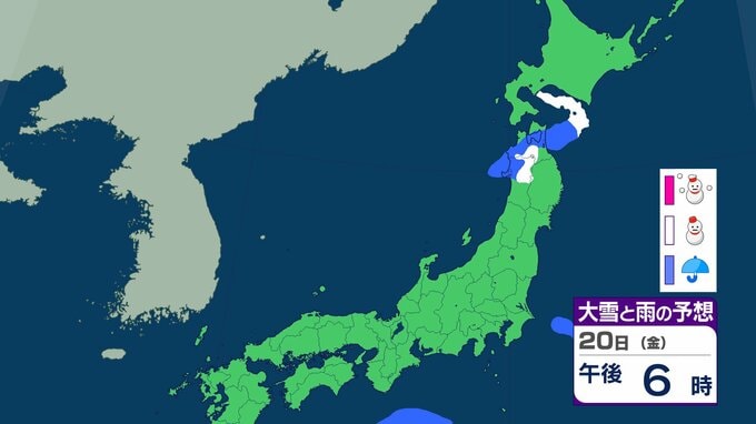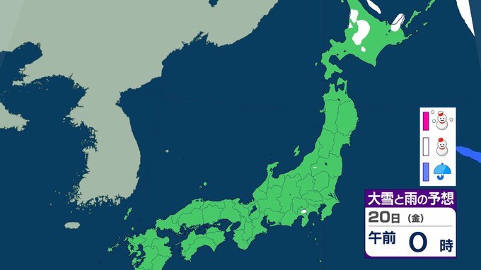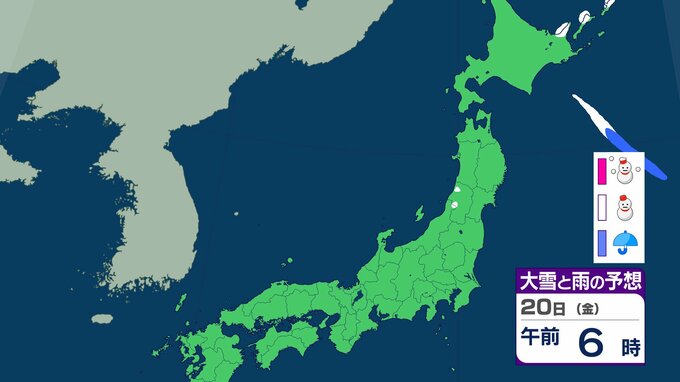 ニュースクリップ 北海道は”猛吹雪”に厳重警戒…19日朝までに40cm降雪か 北~東日本日本海側でも大雪、東北・北陸も30cm降雪予想【雪と雨のシミュレーション】 2026年2月18日(水) 09:38 20日(金)の雪と雨のシミュレーション