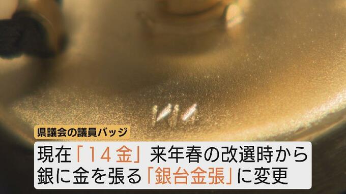 県議会の議員バッジは現在「14金」製ですが、来年春の改選時から銀に金を張る「銀台金張」に変わります。