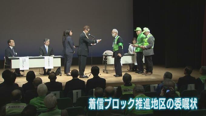 その後、ATSUSHIさんは詐欺被害を未然に防ぐため国際電話の着信ブロックに取り組んできた地区の代表者に着信ブロック推進地区の委嘱状を手渡しました。