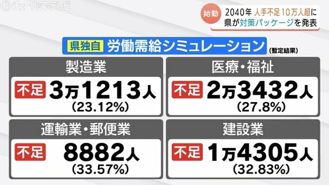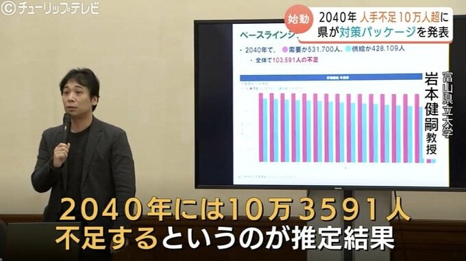 10万3591人という数字は、富山県が独自にシミュレーションした14年後の2040年、県内で生じる人手不足の数です。こうした深刻な人手不足が生じる未来予想図を変えようと、県は、富山で働く価値を高めて「選ばれる富山」になるための総合的な対策パッケージを発表しました。