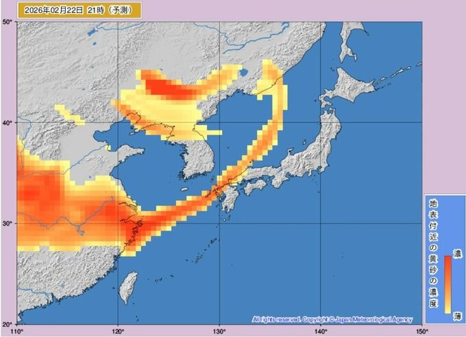 ニュースクリップ 【黄砂】近畿地方 23日は広い範囲で黄砂襲来 所によっては視程5キロメートル未満となる見込み【黄砂予測3時間毎】 2026年2月22日(日) 16:02 国内 22日午後6時予測 22日午後9時予測