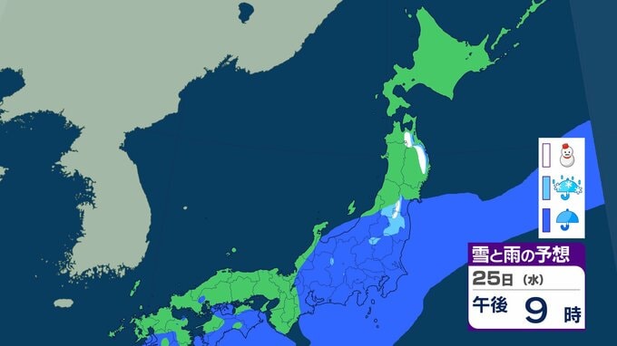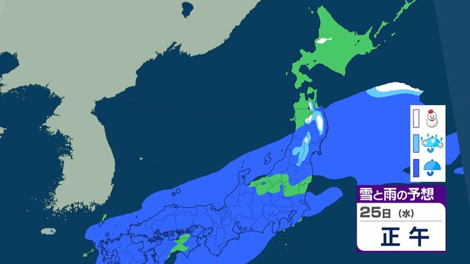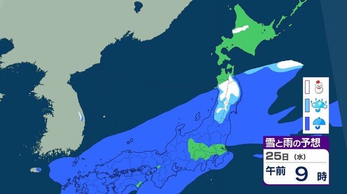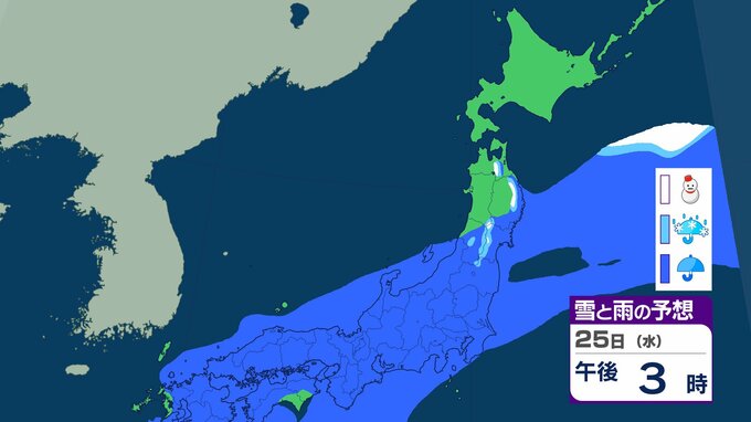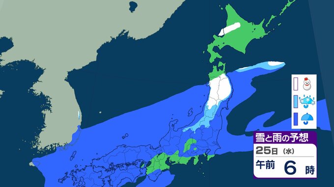 ニュースクリップ 北海道は暴風・高波、西日本は「黄砂」飛来 全国的に大気不安定で竜巻のおそれも…北日本は前線通過後の「大雪」に注意【雪と雨のシミュレーション】 2026年2月22日(日) 19:57 25日(水)の雪と雨のシミュレーション