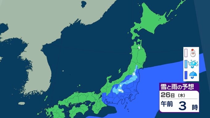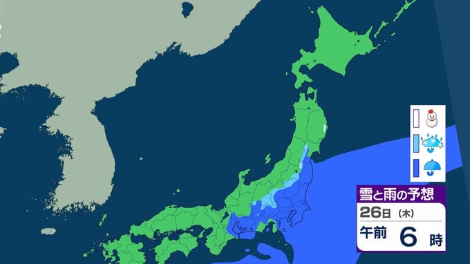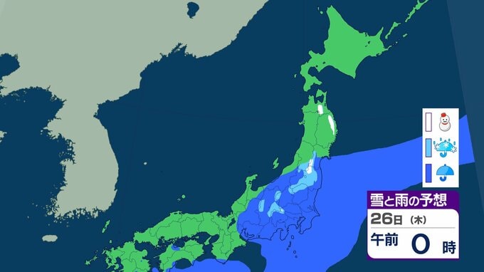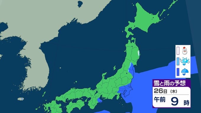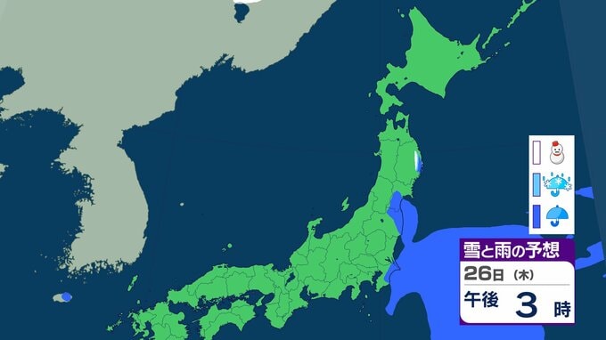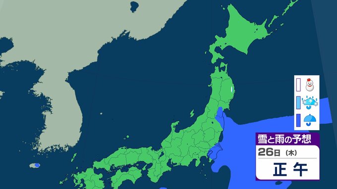 ニュースクリップ 北海道は暴風・高波、西日本は「黄砂」飛来 全国的に大気不安定で竜巻のおそれも…北日本は前線通過後の「大雪」に注意【雪と雨のシミュレーション】 2026年2月22日(日) 19:57 26日(木)の雪と雨のシミュレーション