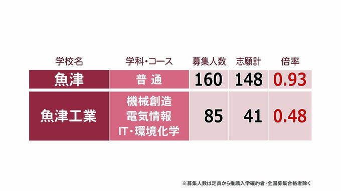 魚津の普通科は0.93倍で定員割れ、魚津工業は定員割れです。