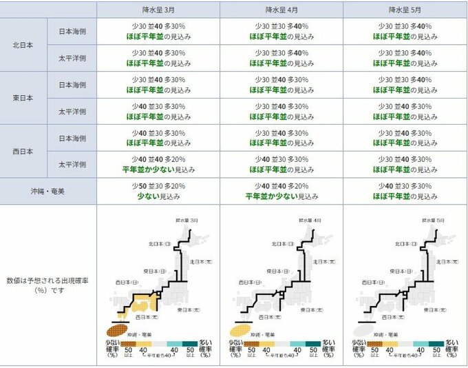 日本太平洋側でも「平年並か少ない」予想です。