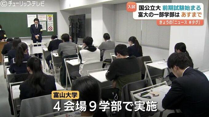 ニュースクリップ 国公立大学の前期試験が一斉スタート 富山大学は9学部で約2500人挑む 一部学部は26日も実施 合格発表は3月7日 2026年2月25日(水) 19:32 国内 国公立大学の前期日程の一般入試が25日全国一斉に始まりました。このうち富山大学では五福キャンパスや杉谷キャンパスなど、4会場で9学部の前期試験が行われ、受験生が国語や数学、外国語などの問題に挑みました。…