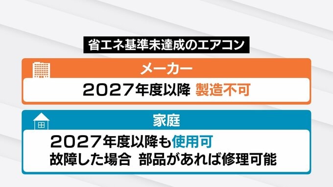 「エアコン2027年問題」により、2027年度以降、メーカー側は、省エネ基準に達していない機種を製造できなくなりますが、家庭で基準に達していない機種を使い続けることは問題ありませんし、仮に故障した場合も、部品があれば、修理も可能だということです。