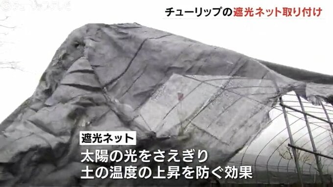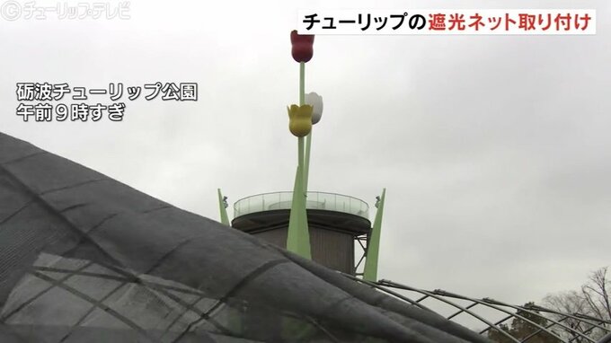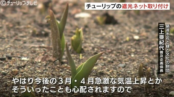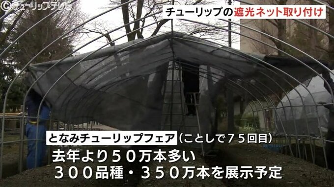 26日、今年4月に富山県砺波市で開幕するチューリップフェアを前に砺波チューリップ公園では開花時期を調整するため遮光ネットの取り付け作業が始まりました。
