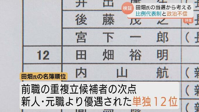 しかし、その翌日、比例の公認リストには田畑氏の名前が。名簿順位は前職の重複立候補者の次で、新人や元職より優遇された単独12位でした。