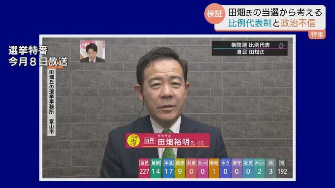 当選直後、田畑氏はチューリップテレビの選挙特番でインタビューに応じました。
