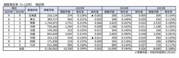 東京商工リサーチが27日発表した2025年の「倒産発生率」調査によりますと、富山県は0.189%で全国14位となり、前年の0.142%(23位)から大幅に悪化したことがわかりました。