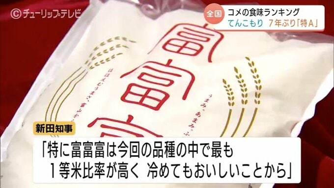 食味ランキングの結果を受けて富山県の新田知事は「特に富富富は今回の品種の中で最も1等米比率が高く、冷めてもおいしいことから生産者、関係者がワンチームとなって生産拡大に努めています。評価が下がったことは誠に残念でありますが、引き続き求められるコメづくりに取り組んでまいります」とコメントしています。