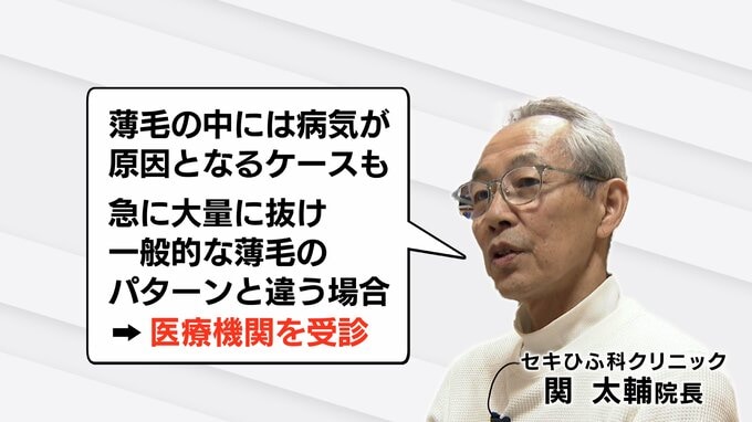 そして注意したいことも。薄毛の中には病気が原因となるケースもあるという点です。例えば、急に大量に抜けたり、一般的な薄毛のパターンと違うと感じた場合は、一度医療機関を受診してほしいと話していました。