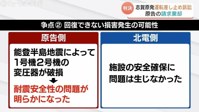 また、再稼働による回復できない損害が生じるおそれについて原告側は「おととしの能登半島地震によって1号機、2号機の変圧器が破損し、油がもれるなど耐震安全性の問題が明らかになった」と指摘。