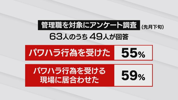 63人のうち49人が回答し、「パワハラ行為を受けた」と回答した人は55%にのぼりました。
