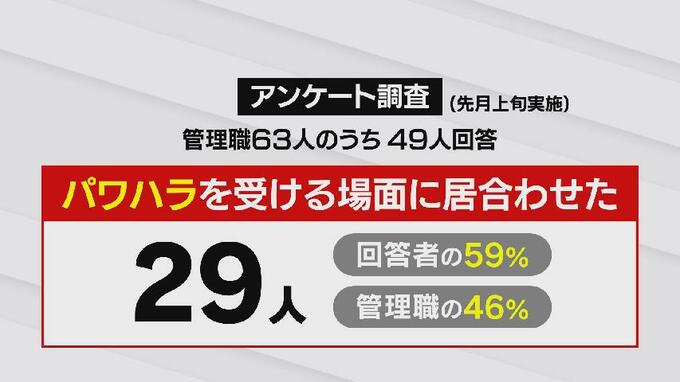 また、「部下や同僚がパワハラを受ける場面に居合わせた」と答えた人は29人で、回答者の59%、管理職全体の46%でした。