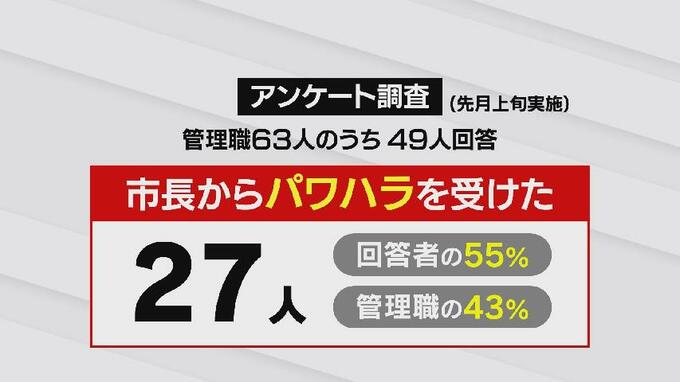 「市長からパワハラを受けた」と回答した人は27人で、回答者の55%にのぼり、管理職全体の43%にあたります。