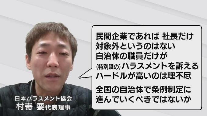 こうしたルール化の動きについて村嵜さんは「民間企業であれば社長だけ対象外というのはない。自治体の職員だけが(特別職の)ハラスメントの訴えをするハードルが高いのは理不尽」「全国の自治体で条例制定に進んでいくべきではないか」とコメントしています。