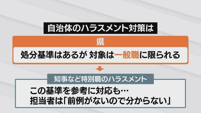 知事などの特別職のハラスメントがあった際はこの基準を参考に対応するということですが、担当者は「前例がないので分からない」ともコメントしています。