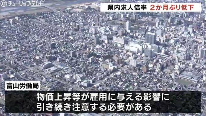 富山労働局は「求人数が求職数を上回って推移し、持ち直しの動きがみられるものの物価上昇等が雇用に与える影響に引き続き注意する必要がある」としています。