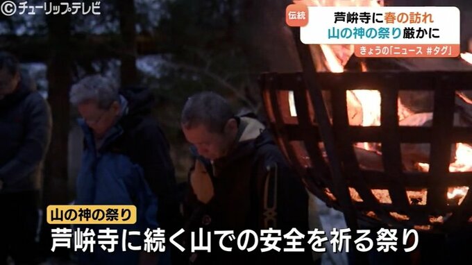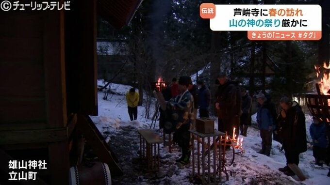 訪れた参加者は、厳かな雰囲気の中、静かに手を合わせ、立山連峰のふもとに本格的な春がやってくるのを待ち望んでいました。