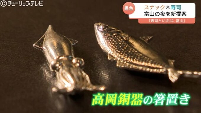 高岡銅器でつくられたホタルイカやブリの箸置きに、ダムから醤油が流れるイメージのプレートなど、工芸品でも目を楽しませてくれます。
