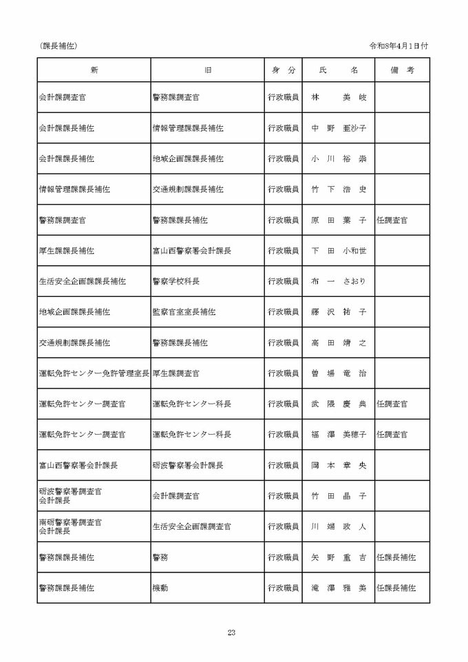 ニュースクリップ 富山県警察本部【春の人事異動 2026年】生活安全部長に青野氏、刑事部長に中林氏など部長級8人、各警察署長、警察業務のデジタル化推進へ 異動826人(退職、再任用、出向含む) 2026年3月12日(木) 10:50 国内 課長補佐など