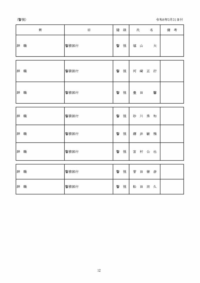 ニュースクリップ 富山県警察本部【春の人事異動 2026年】生活安全部長に青野氏、刑事部長に中林氏など部長級8人、各警察署長、警察業務のデジタル化推進へ 異動826人(退職、再任用、出向含む) 2026年3月12日(木) 10:50 国内 警視(警務部付)