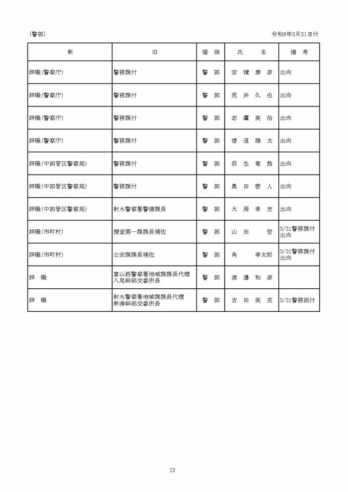 ニュースクリップ 富山県警察本部【春の人事異動 2026年】生活安全部長に青野氏、刑事部長に中林氏など部長級8人、各警察署長、警察業務のデジタル化推進へ 異動826人(退職、再任用、出向含む) 2026年3月12日(木) 10:50 国内 警部(警務課付など)