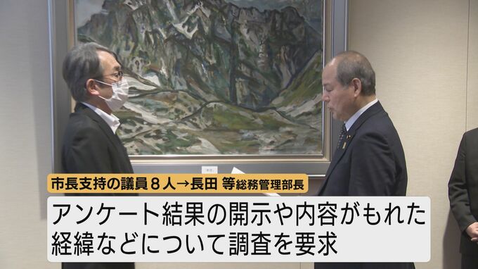 武隈市長を支持する議員8人は今月10日、長田等総務管理部長にアンケート結果の開示や報道機関に内容がもれた経緯などについて調査を要求しました。