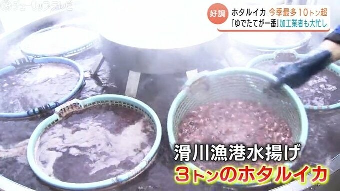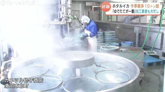 ホタルイカ加工の老舗、滑川市のカネツル砂子商店では、ホタルイカを塩ゆでする作業に大忙しです。