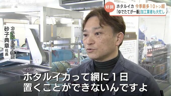 「ホタルイカって網に1日置くことができないんですよ。定置網っていうのは。漁師さんは休みなく毎日出港されますよね。そしたら私たち加工業者も毎日買いに行って毎日仕事するような形になるので、会社全体としては休みなしで動くような形になります」