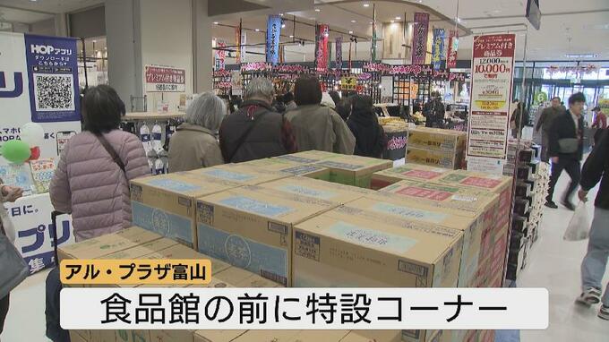 アル・プラザ富山では食品館の前にコメやビール、お茶などを並べた特設コーナーを設けていて、商品券をまとめ買いに利用してほしいとしています。
