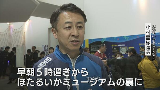 「早朝5時過ぎからこのほたるいかミュージアムの裏にホタルイカの身投げを期待して数百人単位でいらっしゃったんですよ。その方も居残りでミュージアムに入られたりしてますので、朝からこんな状況が続いているという感じですね、にぎやかです」