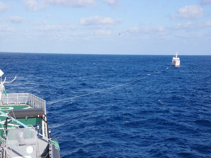 天候回復、専用ケーブルつなぎ曳航開始…