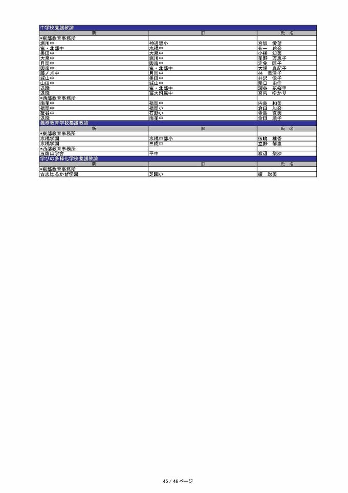 ニュースクリップ 教職員人事異動 2026 富山県「先生どこ行くがけ? 」【事務局・小学校・中学校・高等学校】令和8年・異動一覧【富山県教育委員会】 2026年3月23日(月) 17:00 国内 暮らし・マネー 中学校養護教諭、義務教育学校養護教諭、学びの多様化学校養護教諭 異動一覧2026