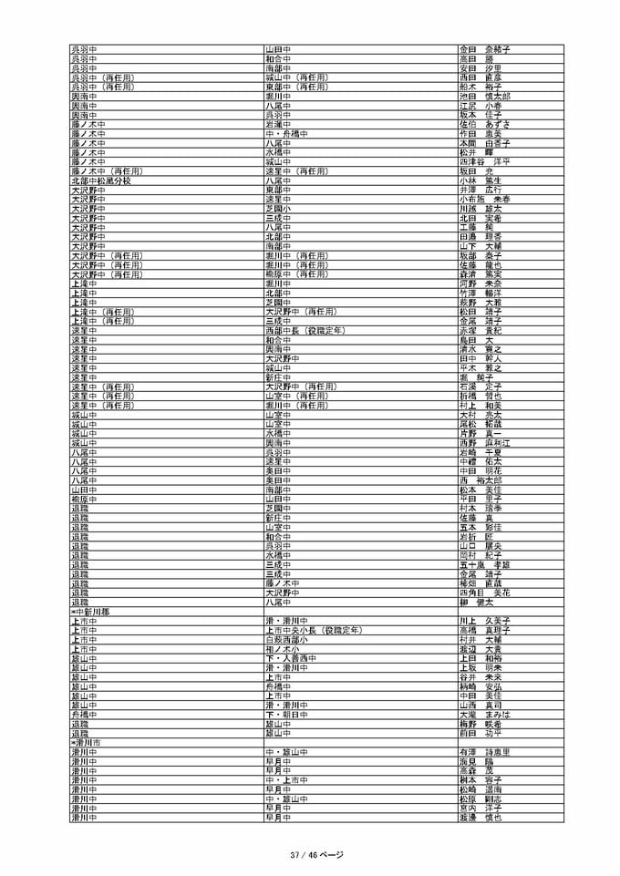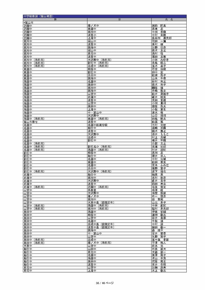ニュースクリップ 教職員人事異動 2026 富山県「先生どこ行くがけ? 」【中学校】令和8年・異動一覧【富山県教育委員会】 2026年3月23日(月) 17:00 国内 暮らし・マネー 中学校教諭(富山地区)異動一覧2026