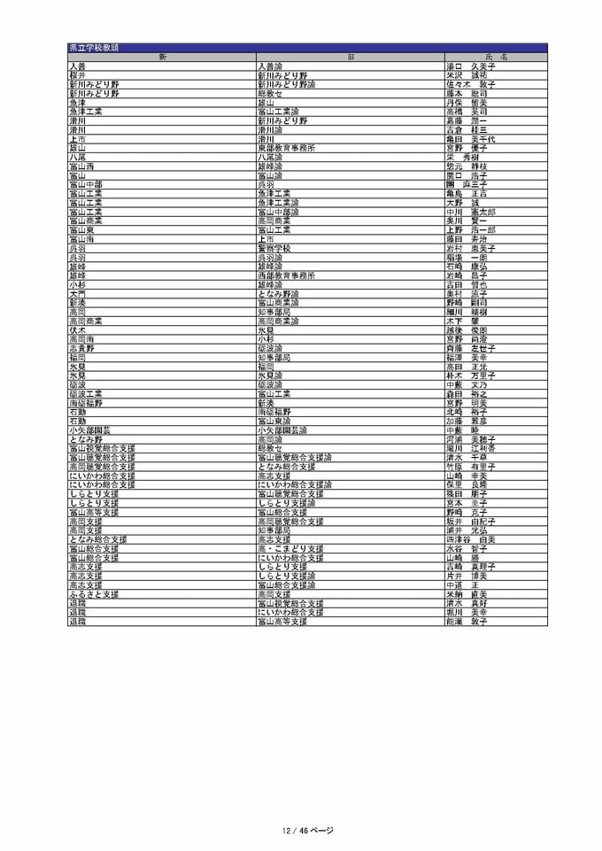 ニュースクリップ 教職員人事異動 2026 富山県「先生どこ行くがけ? 」【校長・教頭】令和8年・異動一覧【富山県教育委員会】 2026年3月23日(月) 17:00 国内 暮らし・マネー 県立学校教頭 異動一覧2026