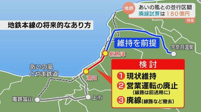 富山地方鉄道本線をめぐっては、あいの風とやま鉄道と並行する滑川-新魚津間の存廃について議論が進められています。今月24日、この並行区間の今後10年間に想定される費用が示されました。廃線した場合の費用は約180億円と最も高く、自治体トップからは「廃止しても効果がない」との指摘も上がりました。県は新年度から議論を主導し、再構築事業も視野に検討する方針です。