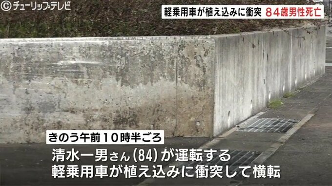 26日午前、富山市惣在寺の市道で軽乗用車が道路脇の植え込みのコンクリートに衝突、横転し運転していた84歳男性が全身を強く打って死亡しました。
